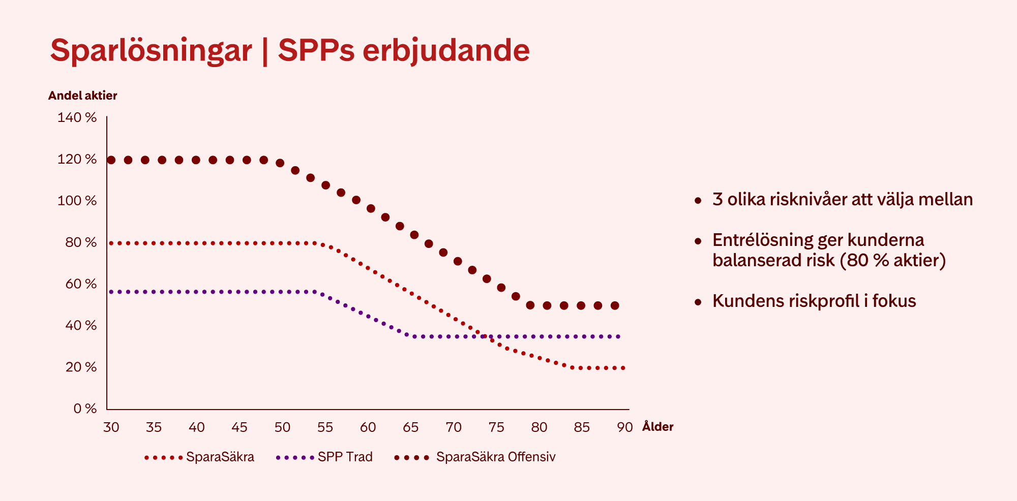 SparaSäkra Offensiv gör det möjligt för kunder hos SPP att välja en pensionslösning som bättre motsvarar deras önskade risknivå. Den nya lösningen kompletterar vårt befintliga utbud för kunder som efterfrågat ett alternativ med högre riskexponering. Illustrationen nedan visar hur våra sparlösningar är uppbyggda vid livsvarig utbetalning.