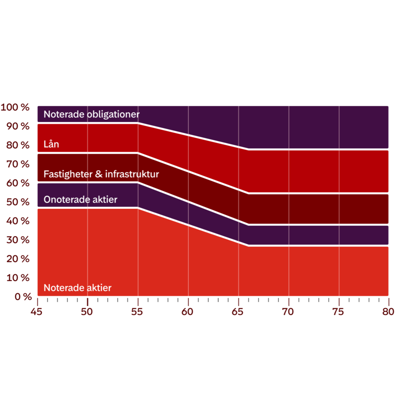 I början placeras pengarna till stor del av aktier. När pension börjar närma sig placeras de om till en högre andel räntebärande placeringar. Cirka 10 år innan utbetalningsstart är en större del av tillgångarna garanterade räntebärande placeringar. På så sätt minskas risken i ditt sprande successivt.